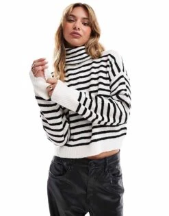 Brave Soul Stripe Roll Neck Jumper In Cream And Black For Women