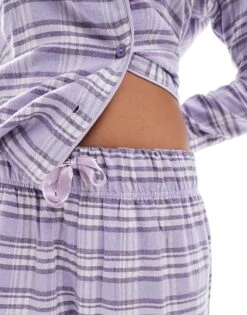Brave Soul Check Longsleeve Shirt And Wide Leg Trouser Pyjama Set In Lilac For Women
