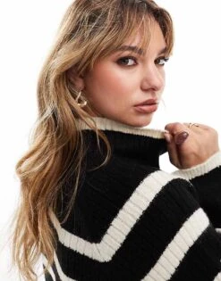 Brave Soul Chunky Rib Stripe Crew Neck Jumper In Black & Cream For Women