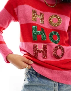 Brave Soul Christmas Jumper In Red And Pink Stripe For Women