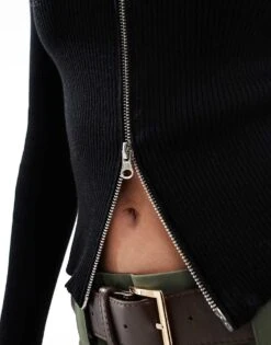 Brave Soul Ribbed Knitted Zip Front Jumper In Black For Women